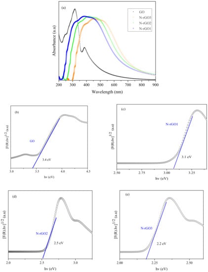 (a) UV/vis absorption spectra of GO, N-rGO1, N-rGO2, and N-rGO3; Tauc′s plots of samples (b) GO, (c) N-rGO1, (d) N-rGO2, and (e) N-rGO3.