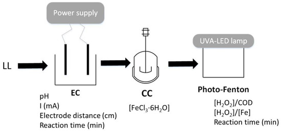 Precisely, the combination of EC and conventional coagulation (CC) has not been assessed yet, although it might be a good alternative to achieve high pre-treatment efficiency before an AOP without the drawback of the addition of counterions in the case of CC standalone or the high power consumption of a single EC pre-treatment. This combination was previously used for the successful pre-treatment of palm oil effluent [27], slaughter house wastewater [28], and textile wastewater [29], but there are no references to the application of this coagulation combination as pre-treatment for LL depuration before an oxidation treatment. Furthermore, there might be further advantages if the coagulant used in both coagulation pre-treatments is iron, as the remaining iron content may serve as the catalyst in a posterior photo-Fenton treatment. In short, the hypothesis that an enhanced coagulation by the combination of coagulation pre-treatments before an optimized photo-Fenton treatment might be more efficient in removing the contaminant load at a lower or similar total cost deserves investigation. Therefore, the main objective of this study was to assess the synergic effects of the combination of EC and CC as pre-treatments of a UVA-LED photo-Fenton treatment of mature LL in terms of treatment efficiency and cost that might provide a potential feasible LL treatment strategy to be considered for full-scale applications.