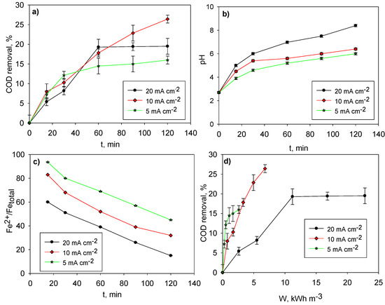 It should be noted that the first species formed during EC was Fe2+, which was oxidized to Fe3+ thanks to the application of current density, and it was Fe3+ which was actually implicated in removing the major fraction of the COD during the coagulation process. As pH was increasingly pushed above the optimal value of 4–5 for Fe3+ coagulation along the processes, and as current density was pushed higher as well, the ratio Fe2+:Fetotal correspondingly decreased (Figure 2b,c). Considering all the above, it finally resulted that the overall removal of the COD was optimized for a current density of 10 mA cm−2 (>25%), whereas it was lower for either 5 or 20 mA cm−2 (≈15–20 %) (Figure 2a–d) because the current density value was too low in the first case and because the pH increased too much above optimal values of coagulation performance in the second one.