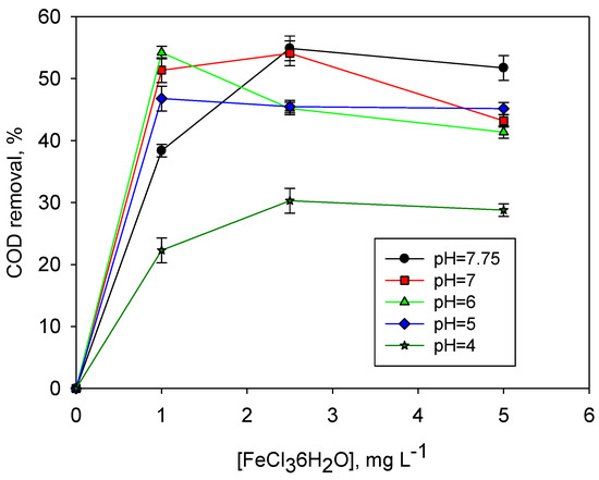 The electrocoagulated LL had a slightly higher COD than the coagulated LL, with a COD value of 1856 mg O2 L−1 and a pH = 7.75. Figure 2 presents the results of the EC followed by CC trials. In general, the required concentration of the coagulant (FeCl3∙6H2O) to obtain better COD removal results decreased when the initial pH was adjusted to more acidic values before the CC stage. The two highest tested initial pH values (7.8 and 7.0) achieved an extra COD removal of 54% at a dose of 2.5 g L−1. Reducing the pH to 6 before CC resulted in the same 54% COD removal at the lower dosage of 1 g L−1. However, if the pH was further reduced, COD removal decreased to 46% for an initial pH = 5 and 1 g L−1 of coagulant and even down to 30% for an initial pH = 4 and a dose of 2.5 g L−1 (Figure 3). This effect was the result of the acidification of the medium that occurred when the coagulant was added. In a first step of coagulation, Fe3+ was hydrolyzed capturing −OH, as expressed by the following overall equation: FeCl3 + 3H2O → Fe(OH)3 + 3HCl; thus, a subsequent reduction of the pH was produced.