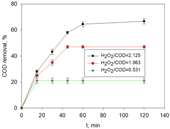 The COD removals achieved in this step were 66%, 47%, and 21% for the UVA-LED photo-Fenton treatment performed using [H2O2]:COD concentration ratios of 2.125, 1.063, and 0.531, respectively, and the times required for such treatment results were 120, 45, and 15 min, respectively (Figure 4). Obviously, a lower H2O2 addition limited the COD removal result, and the duration of the reaction was shorter because the added H2O2 was totally consumed more quickly.