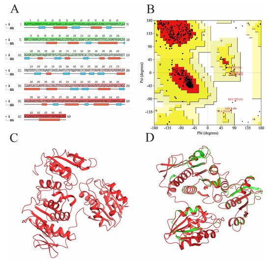 Demonstration and validation of MurD enzyme modeling proteins. (A) MurD Ligase sequence of S. aureus. (B) The Laplace diagram verification of S. aureus MurD Ligase represents 358 residues in the most favored region (red), 39 residues in the additional allowable region (yellow), 5 residues in the generous allowable region (light yellow), and 1 residue in the prohibited region (white). (C) Homologous model of MurD Ligase of S. aureus. (D) 3D comparison between MurD Ligase model shown in red and MurD crystal structure of Streptococcus agalactiae shown in green (PDB: 3lk7) as template.