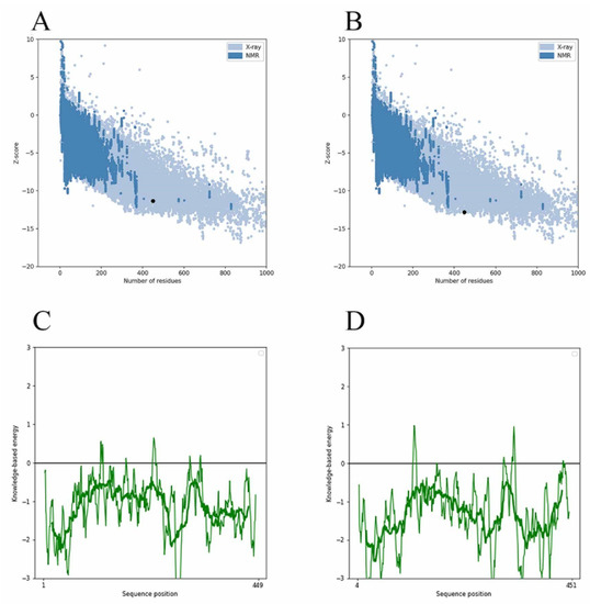 Since the MurD enzyme catalytic domain is lacking in the protein model, the Maestro 11.5 prime module was used for homology modeling in the study, while the MurD crystal structure of Streptococcus agalactiae (PDB: 3lk7) was used as the template. After comparison, it showed that it had 46.85% homology. The generated protein sequence is shown in Figure 1A below. Then, the structure of the protein is optimized by GROMACS 2019.4 to supplement the wrong part in the side chain. The optimized protein model uses PROCHECK (https://saves.mbi.ucla.edu/, accessed on 17 September 2021) to predict the quality of the model, and the online website PROSA (https://prosa.services.came.sbg.ac.at/prosa.php, accessed on 17 September 2021) to assess the quality of the built models. In the Ramachandran plot produced by the PROCHECK website, Figure 1B shows 88.8% residue in the most popular regions, 9.7% residues were found in the allowed areas, 1.2% residues were found in the generous areas, and only 0.2% residue was found outside. Therefore, it is concluded that 99.8% residues were found in the favorable region, while only 0.2% residue was found in the external region, which proves that the quality of the model is good. Figure 1C,D are the superposition diagrams of the modeling protein and the template, respectively. The PROSA test was used to compare the energy standard between the predicted model and known X-ray and NMR structures. The PROSA energy diagram was calculated to check the interaction energy of all residues of the prediction model [25]. The results showed that the z-score of the optimized protein in Figure 2A reached −11.68, while that of the template protein in Figure 2B was −12.81. The PROSA analysis of the model showed that most residues had negative interaction energy, while a few residues showed positive interaction energy. Figure 2C reflects the interaction energy of the MurD enzyme protein, and Figure 2D represents that of the 3l7k protein. In general, the analysis results of PROCHECK and PROSA prove the accuracy of the homologous modeling model; therefore, this protein can be investigated further [26].