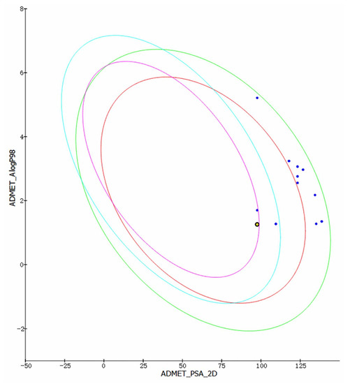 Drug formation analysis was completed by using the Discovery Studio 4.5 ADMET module (Dassault, Paris, France) and Maestro 11.5 Qikprop module to check the drug properties of molecules. The ADMET module was based on atomic logP98, polar surface area (PSA), blood–brain barrier (BBB), cytochrome P450 and hepatotoxicity. The blood–brain barrier was divided into different levels, 3 (low: brain–blood ratio less than 0.3:1) and 4 (undefined: outside 99% confidence ellipse). In addition, the polar surface area was calculated by using the method based on the sum of the list surface contributions of polar fragments called topological PSA (TPSA). Compounds with PSA < 140 and logP98 < 5 represent higher cell permeability. ADME was also calculated through Maestro 11.5 Qikprop module, and the calculated characteristics include HERG, CNS activity, H-bond donor, H-bond receptor, log PO/W, logS, log BB and PMDCK.