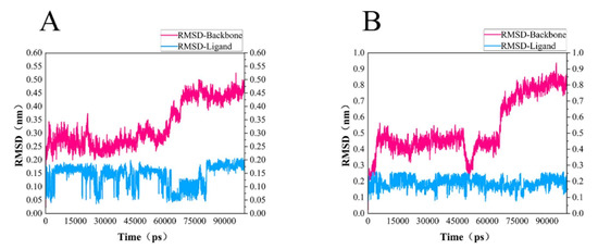 RMSD of protein and ligand. (A) RMSD diagram of 46604 and MurD enzyme complex backbone (magenta) and ligand 46604 backbone (blue). (B) RMSD diagram of 46608 and MurD enzyme complex backbone (magenta) and ligand 46608 backbone (blue).