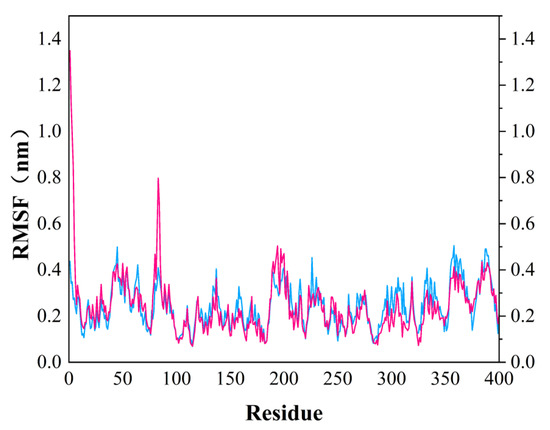 In order to test the stability of S. aureus MurD enzyme protein binding with two ligands, 100 ns molecular dynamics simulation was carried out, and its output was analyzed as follows. The simulation results of the two composites are supplemented in the following materials (Figure 6). In the 100 ns simulation, both complexes can converge to the equilibrium state in the last 25 ns. Among them, the 46604 complex converges to the equilibrium state faster than the 46608 complex. After the two complexes reach the equilibrium state, they can continue to the stable state until the end of the simulation. The 46608 complex showed obvious amplitude, experienced obvious conformational changes, and reached a steady state more slowly. RMSD diagrams of ligands in Figure 6A,B were further analyzed; it can be found that 46608 as a whole is relatively stable in this process without too much fluctuation, while 46604 has some fluctuation in the first 75 ns, and finally reaches equilibrium in about 80 ns. The detailed analysis of the root mean square fluctuation (RMSF) of each residue base in Figure 7 is also used to determine the residue fluctuation and flexibility throughout the simulation period. The RMSF of the two complexes are close and show similar shape distribution.