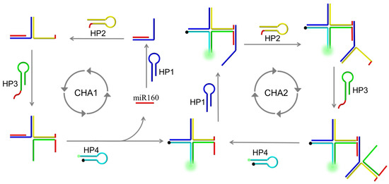 In this manuscript, we present an automatic molecule machine (AMM) based on the dual catalytic hairpin assembly (D-CHA) process for the signal amplification detection of ARF-targeted miRNA160. The general CHA reaction uses complementary DNA strands as DNA probes and is introduced into hairpin-shaped structures before the detection [45,46,47], providing several advantages, such as low detection cost, convenient storage, low background signal, and simple operation [48,49,50]. The CHA-based detection has been used as a satisfactory alternative amplification method for the detection of numerous biomarkers in medical diagnoses [51,52,53] and combined with different analytical techniques, such as fluorescence, electrochemistry, colourimetry, surface plasmon resonance (SPR), and electrophoresis [54,55,56,57,58]. In this work, the AMM system contains four hairpin-shaped DNA probes (HP), including HP1, HP2, HP3, and HP4. Specifically, HP1 was used as a recognition element for miRNA160. A DNA fragment with the same sequence as target miRNA160 is split into two halves and innovatively introduced at the 3′ end of HP2 and 5′ end of HP3, respectively. A pair of fluorophore (FAM) and quencher (BHQ1) molecules are modified at the ends of HP4 for signalling. After the target induces the assembly of four-way DNA junction (F-DJ) based on the first catalytic hairpin assembly (CHA), the split DNA halves are brought together and serve as an integrated target analogue to initiate the second CHA reaction. This dual-CHA-based signal amplification is termed D-CHA. The comparative experiments have demonstrated that the D-CHA strategy displays a better assay performance compared with traditional CHA, possessing several advantages, such as simple operation procedure, high sensitivity, and specificity.