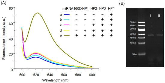 Considering the intrinsic characteristics of RNA, such as susceptibility to nuclease degradation, a DNA analogue of miRNA160 (named miRNA160D) was used in this section. The feasibility of the AMM system for the miRNA160D amplification detection was validated by collecting the fluorescence spectrum. As shown in Figure 2A, the low fluorescence intensity is detected for HP4 in sample a, indicating that FAM is effectively quenched by the BHQ1 due to the hairpin-shaped structure of HP4. Subsequently, when HP3, HP2, and HP1 were successively added to HP4, no substantial increase in fluorescence intensity was detected, as shown in samples b, c, and d, and demonstrated that the four hairpin-shaped DNA probes could stably coexist in the absence of target miRNA. In contrast, the high fluorescence intensity can be detected once the target is added to sample e, revealing that AMM can provide an intense signal response. The data in Figure 2B shows that the F-DJ prepared from the D-CHA-based system triggered by target (i) and the reaction mixture (ii) of HP1, HP2, HP3, and HP4 after annealing have identical gel mobility. Overall, the low background and the high signal response of the AMM system demonstrate that it is suitable for the target detection with a low expression, such as miRNAs.