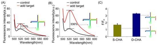 To provide convincing evidence for the D-CHA amplification effect, the closely-related comparative experiments were performed. A CHA-based system with the same component was used as control, but HP2-VI without the extended end was used instead of HP2. After the first CHA reaction, the four-way DNA junction (F-DJ) is formed, and the second CHA cannot be triggered owing to the lack of a combined target analogue. The corresponding assay system is called a single CHA-based one (S-CHA). As shown in Figure 3, only a 170% fluorescence increase is detected for S-CHA in the presence of target miRNA, while the fluorescence intensity of D-CHA increases by 336% upon target stimulation, demonstrating that the combined target analogue efficiently contributes to the signal amplification. Moreover, the fluorescence increase of the D-CHA-based system is much higher than S-CHA, indicating that the design of D-CHA does promote the autocatalytic reaction acceleration (See Supplementary Materials Figure S1).