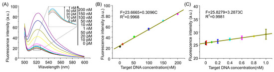 Subsequently, the assay performance of the AMM system was evaluated by probing a series of different concentrations of miRNA160D under the optimized experimental conditions. As shown in Figure 4A, the signal intensity at 520 nm gradually increases with the increase in target concentration, demonstrating that the quantitative detection of miRNA160D can be achieved. The fluorescence spectra of AMM in the presence of a low concentration of target miRNA can be found in the inset. If the target concentration is capable of generating a detectable signal higher than the background, it is defined as the limit of detection (LOD), the LOD as low as 10 pM is achieved for miRNA160D detection. Figure 4B,C plots the fluorescence intensity against the target concentration in the high concentration range and low concentration range, where F and C represent the peak fluorescence intensity and the miRNA160D concentration, respectively. Meanwhile, a detectable signal can be obtained in the presence of a synthetic RNA target (Figure S4) or extracted RNA from peach (Figure S5), indicating the feasibility of the method for RNA detection.