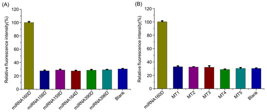 The selectivity is another essential parameter for evaluating the assay performance of DNA probes. To test the selectivity of the AMM machine, the DNA surrogates of common plant miRNAs (miRNA156D, miRNA159D, miRNA164D, miRNA390D, miRNA396D) were detected against miRNA160D under identical conditions. As exhibited in Figure 5A, if defining the signal intensity induced by miRNA160D is 100%, the relative fluorescence signal of non-target miRNAs is not more than 30%, demonstrating a high detection specificity of AMM towards target miRNA. Moreover, five mutant targets were retrieved from the miRBase database (http://www.mirbase.org/) (accessed on 10 September 2021), including one-, two-, three-, four-, and five-base mismatched target (MT1, MT2, MT3, MT4, and MT5), were detected. As depicted in Figure 5B, no substantial signal increase is observed upon mutant targets compared with the background. The feasibility of AMM for discriminating the mutant miRNA from miRNA160D has also been demonstrated via a blind test (Table S2). Namely, AMM is able to discriminate the single-base-mismatched targets, indicating a high capability to distinguish mismatched targets. Besides, compared with previous CHA-based probes, AMM displays comprehensive advantages (Table S3).