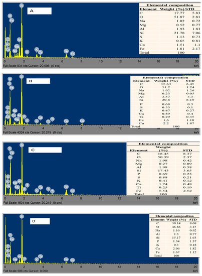 SEM/EDX was used to investigate the compatibility and morphology of the digestate before and after 30 days of incubation. The interfacial adhesion and dispersion of the MNPs in the digestate is presented in Figure 1. At a micrograph scale of 5 µm, the digestate surface profile was taken at a high magnification of 10k× with a width view size of 20.8 µm. The raw sludge (Figure 1F) shows a porous structure with an irregular shape, revealing the potential of active microbes for biodegradation. However, after 30 days of incubation, the particle surface with Fe2O4-TiO2 (Figure 1A) was found to be much smoother than the original digestate (Figure 1F). The micrograph indicates that the digestate with MNPs (Figure 1A–D) consisted more of cluster cells, while that without (Figure 1B,C) consisted more of filamentous clusters. Figure 1A,D also reveal that the micrograph images include flower-like particles, with many apertures distributed along the surface. This suggest the digestate, which consisted of Fe2O4-TiO2 and Chitosan- Fe2O4/TiO2 in bioreactors A and D, may have increased the contact surface (Figure 1A,D), reactivity and degradation efficiency in reducing contaminants as well as increasing biogas production [6,8].