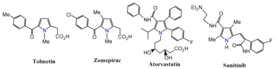 Pyrrole is a five membered heteroaromatic compound with one nitrogen atom in the ring. The pyrrole core is usually encountered among natural compounds, the best-known being the heme, chlorophyll, vitamin B12, and marine alkaloids (e.g., lamellarins, storniamides) [1,2,3,4,5,6]. The importance of natural and synthetic pyrroles arises from their wide range of applications in various fields such as medicinal chemistry, catalysis, dyes, and materials science [5,6,7,8,9,10,11,12,13]. A great number of natural or synthetic pyrrole derivatives have been found to exhibit a variety of biological activities such as antimicrobial, anti-inflammatory, anticancer, antiviral, antihypertensive, etc. [2,5,6,7,8,9,10,11,14,15,16]. The best-known marketed drugs containing substituted pyrrole nucleus [6,7,8,10] are tolmetin and zomepirac, nonsteroidal anti-inflammatory drugs used for treatment of rheumatoid arthritis and pain [10]; atorvastatin used for the treatment of dyslipidemia and to prevent cardiovascular diseases [7]; and sunitinib used in cancer treatment [17] (Figure 1). From the marine alkaloid group with the tri- and tetrasubstituted pyrrole ring, lamellarins O, Q, R for their anticancer activity [5] and storniamids A–D for antibacterial activity [3] stand out (Figure 2). Additionally, pyrroles are useful building blocks [18,19,20,21] in the design and synthesis of naturally occurring compounds, functionalized materials, and new bioactive condensed heterocycles, and as a consequence, the interesting synthetic aspects and applications of the compounds possessing the pyrrole core have been reviewed [9,10,11,12,13,18,22,23,24,25,26,27,28,29].