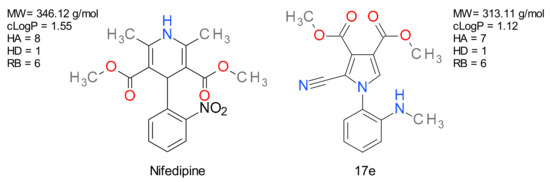 The 1,4-dihydropyridine (DHP) class is frequently the first choice of drug used in the treatment of hypertension [30] and angina [31]. Their mechanism of action is the inhibition of the L-type calcium-dependent calcium channel in the cardiovascular system. The new synthetized compounds were designed to resemble the structure of nifedipine, the prototype for the DHP class, by using a phenyl substitution at the N-pyrrole atom and a methlyamino group as substitution for the nitro group of nifedipine. In Figure 3, the structure of one of the new compounds (17e) is presented next to that of nifedipine together with relevant structural descriptors.