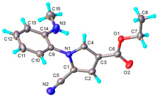 The compound was purified by crystallization from 2-propanol as colorless crystals with mp 145–148 °C; Yield 46%. Anal. (%) Calcd. for C15H15N3O2 (269.30 g/mol): C, 66.90; H, 5.61; N, 15.60. Found C, 67.22; H, 5.89; N, 15.87. IR (ATR solid, ν cm−1): 1699 cm−1 (νC=O); 2223 cm−1 (νC≡N); 3131 cm−1 (νCH); 3410 cm−1 (νNH); 1H-NMR (300 MHz, CDCl3) δ ppm: 1.28 (t, 3H, J = 7.1 Hz, MeCH2), 2.75 (d, 3H, J = 4.9 Hz, MeNH), 3.45 (q, 1H, J = 4.9 Hz, NH), 4.24 (q, 2H, J = 7.1 Hz, CH2O), 6.68–6.80 (m, 2H, H-3′, H-5′, N-aryl); 7.06 (dd, 1H, J = 8.0, 1.4 Hz, H-6′, N-aryl), 7.29–7.34 (m, 1H, H-4′, N-aryl), 7.31 (d, 1H, J =1.6 Hz, H-3, pyrrole); 7.45 (d, 1H, J = 1.6 Hz, H-5, pyrrole); 13C-NMR (75 MHz, CDCl3) δ ppm: 14.4 (MeCH2), 30.2 (MeNH), 60.6 (CH2O), 107.0, 118.5, 122.5 (3C, quaternary), 111.5 (C-3′), 112.0 (CN), 116.7 (C-5′), 121.7 (C-3), 127.7 (C-6′), 131.4 (C-4′), 131.7 (C-5), 144.7 (C-1′), 162.8 (COO).
