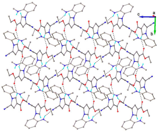The structures of the pyrroles were confirmed by single crystal X-ray diffraction study of the representative pyrrole 17c. This compound crystallizes in the P21/c space group of the monoclinic system, its molecular structure being constructed from neutral units, as shown in Figure 4. The 17c molecule is essentially non-planar: the dihedral angle between two planar fragments formed by pyrrole and phenyl rings (along with their substitutes) was 96.523(2)°. The analysis of the molecular structure shows the presence of atom groups that can serve as donors and acceptors for intermolecular H-bonding. As a result, the neutral molecules are interacting in the crystal to form two-dimensional supramolecular layers, as illustrated in Figure 5. The crystal structure is generated via parallel packing of the above-mentioned, weakly interacting, 2D supramolecular architectures. A partial crystal packing viewed along the b-axis is shown in Figure 6. The crystallographic and refinement details are given in Table 1.