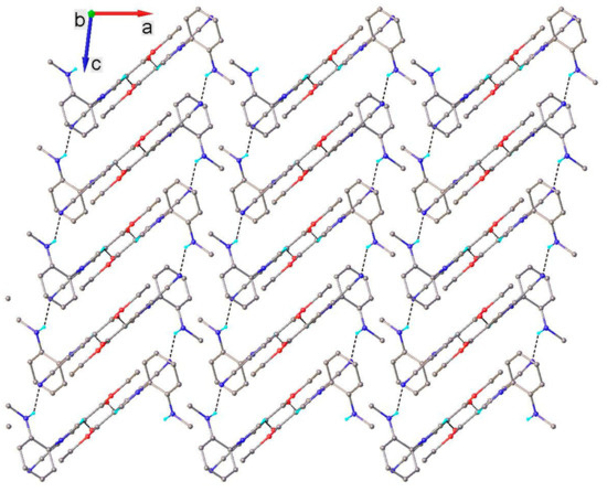2D-supramolecular network in the crystal structure 17c. Non-relevant are omitted. H-bonds parameters: N3-H⋅⋅⋅N2 [N3-H 0.88 Å, H⋅⋅⋅N2 2.30 Å, N3⋅⋅⋅N2(x, 0.5–y, z–0.5) 3.075(2) Å, ∠N3HN2 147.4°]; C4-H⋅⋅⋅O2 [C4-H 0.95 Å, H⋅⋅⋅O2 2.36 Å, C4⋅⋅⋅O2(1–x, 0.5 + y, 0.5–z) 3.075(2) Å, ∠C4HO2 143.7°].