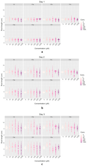Except for compound 17b, the mixed-effects models based on all data indicated a statistically significant inhibitory effect for the two highest concentrations (p < 0.001 and p = 0.006, respectively), a significantly stimulatory effect for the two lowest concentrations (p < 0.001), and a null effect for the middle concentration (Figure 7). Except for derivative pyrrole 17b, which exerted an inhibitory effect, the other compounds did not differ significantly from salt 13. Analyses performed on measurements carried out on the second day were generally consistent with this finding. Ordinary least squares regression as well as the different versions of robust regression (treating the control as the zero concentration level) were similar in their results, indicating very small differences among the tested compounds (13, 17a to 17f) and a small effect for the concentration: the standardized coefficients were not larger than 0.16 (in absolute value) (i.e., their influence on root growth was not larger than 0.16 standard deviations). The coefficients of determination for the different models were around 0.09, which means that the contribution of substances and concentration to the variability observed in Triticum root length were limited to less than 10% (i.e., a very small effect). A very small inhibitory effect was only found for the highest two concentrations (1000 and 500 μM)—standardized coefficients of −0.15 and −0.10 in the OLS model, an almost null effect for the middle concentration (beta −0.01) and a small stimulatory effect at the lowest two concentration levels (standardized coefficients of 0.10 and 0.15, respectively); the effect was significant only for the highest concentration level (1000 μM) and two lowest levels (10 and 50 μM). Using salt 13 as a reference, none of the other compounds differed significantly in their inhibitory effects, the majority rather having slightly (but statistically non-significant at the conventional 0.05 threshold) stimulatory effects, with the possible exceptions of 17c (p = 0.024 in the “lmRob” robust regression model and p = 0.06 in a “lmrob” regression) and 17a (p = 0.026 in the “lmRob” model, but p = 0.172 in the “lmrob” model). Treating the control group as a substance (as opposed to the zero level concentration), none of the compounds differed significantly from it. Considering the very small effects of the compounds and concentrations, no IC50 values are reported, as they would make little sense (and the 95% confidence intervals were very wide). This may allow for the conclusion that the compounds have little phytotoxic effects on Triticum aestivum in the experimental setting used.