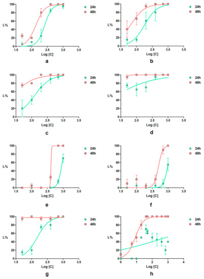 Daphnia magna lethality curves for the tested compounds: (a)—13; (b)—17a; (c)—17b; (d)—17c; (e)—17d; (f)—17e; (g)—17f; (h)—nifedipine; error bars represent the standard error of the mean.