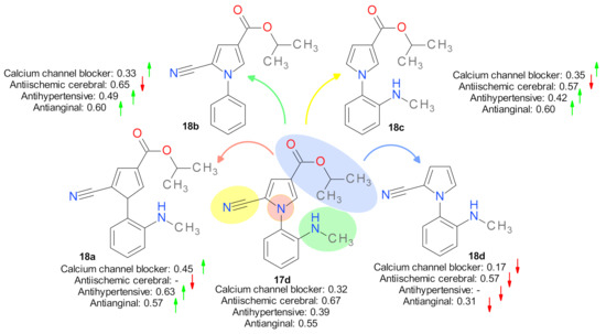 The elimination of the ester group is predicted to reduce the probability of structure 18d to have antihypertensive, anti-anginal, and cerebral anti-ischemic effects indicating the importance of this element. The removal of the nitrile or the methylamino groups changes the probability of blocking the calcium channels very little, and slightly improves the potential of antihypertensive and anti-anginal effects. Interestingly, the substitution of the pyrrole nitrogen with a carbon atom is predicted to improve the chances to function as a calcium channel blocker and to produce antihypertensive and anti-anginal effects. However, this transformation eliminates the cerebral anti-ischemic properties.