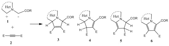 The 1,3-dipolar cycloaddition reaction between heteroaromatic N-ylides 1 and acetylenic dipolarophiles 2 (Scheme 1) is one of the most accessible synthetic procedures in the construction of condensed aromatic N-heterocycles of type 6 possessing a pyrrole ring [32,33,34,35,36,37,38,39,40,41,42]. The final reaction products 6 result via the initial formation of the dihydroderivative structure 3, followed by its rearrangement to 4 or 5 (Scheme 1). In the reaction conditions or in the presence of an oxidizing reagent, these intermediates undergo further aromatization to the pyrrolo-condensed compounds 6.