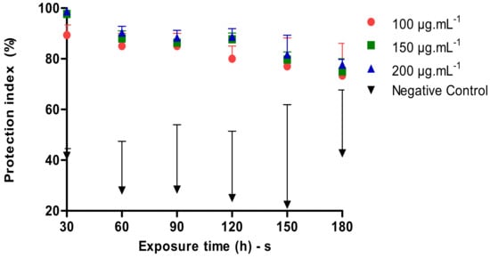 The Figure 3 below shows a comparison of the Protection Index of different concentrations of the tested nanoemulsion and the controls depending on the application time. During the test, the positive control did not present any sting and/or landing. In 30 min after the application of the product in the different concentrations, a protection index of 89.34%, 97.67% and 98.67% was demonstrated, whereas in the time of 60, 90, 120, 150 and 180 min, the results in the three concentrations 100, 150 and 200 µg·mL−1 were significantly smaller compared to the control. All tested concentrations at the 180 min application protected around 73.34%, 75.00% and 77.67%.