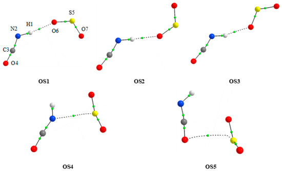 At all levels of theory, five minima were found for the 1:1 HNCO⋯SO2 complex. Figure 1 shows the MP2 optimized geometries of these molecular complexes. Their MP2 calculated values of intermolecular distances and angles are presented in Table 1. Cartesian coordinates of the optimized species are provided in Table S1 in Supplementary Material. The values of two important topological AIM [55] parameters: the electron density ρ(r) and its Laplacian ∇2ρ(r) at the critical points are also shown in Table 1. Additionally, the positions of the bond (3,-1) critical points derived from AIM calculations are depicted in Figure 1. These data provide valuable information on different kinds of non-covalent bonds and intermolecular interactions in the studied complexes.