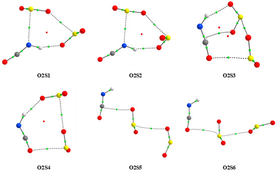 According to the calculation methods used, six and ten minima are present for 1:2 and 2:1 complexes, respectively. Figure 2 shows the optimized geometries of 1:2 complexes and those of the 2:1 composition are presented in Figure S1 in the Supplementary Materials. Cartesian coordinates of all optimized species are gathered in Table S1. The analogous information as for 1:1 species (Table 1) derived from AIM calculations for 1:2 and 2:1 complexes is presented in Tables S2 and S3 in Supplementary Material.