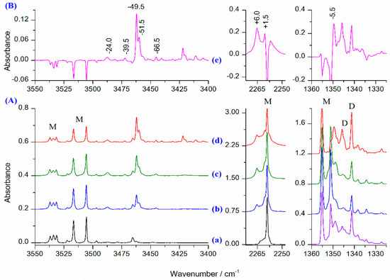 (A) The νNH, νasNCO and νasSO2 regions in the spectra of matrices: HNCO/Ar = 1/6000 or SO2/Ar = 1/1400 (after 5 min at 30 K/10 K) (a), HNCO/SO2/Ar = 1/2/5600 (b), HNCO/SO2/Ar = 1/4/5600 (c), and matrix (c) after 10 min at 30 K/10 K (d). (B) The difference spectrum (e) obtained by subtracting the spectrum (a) from the spectrum (d) (pink trace). The letters M and D denote HNCO and SO2 monomers and dimer bands, respectively.