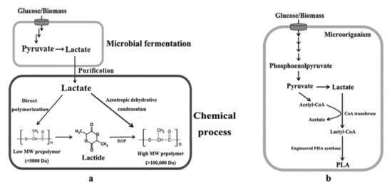 - Jung, Y.K.; Lee, S.Y. Efficient production of polylactic acid and its copolymers by metabolically engineered Escherichia coli. J. Biotechnol. 2011, 151, 94–101. [Google Scholar] [CrossRef]