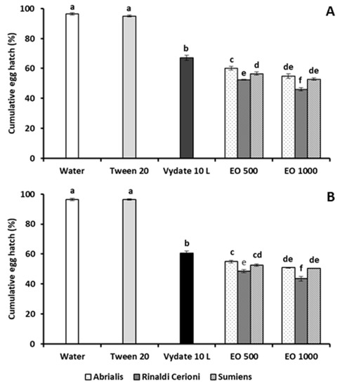 The lowest egg percentage hatch was recorded after the egg mass immersion in a 100 µg·mL−1 solution of the cv Rinaldi Cerioni EO, 46.1% and 43.6% vs. 96.3% and 96.4% of water control, respectively.