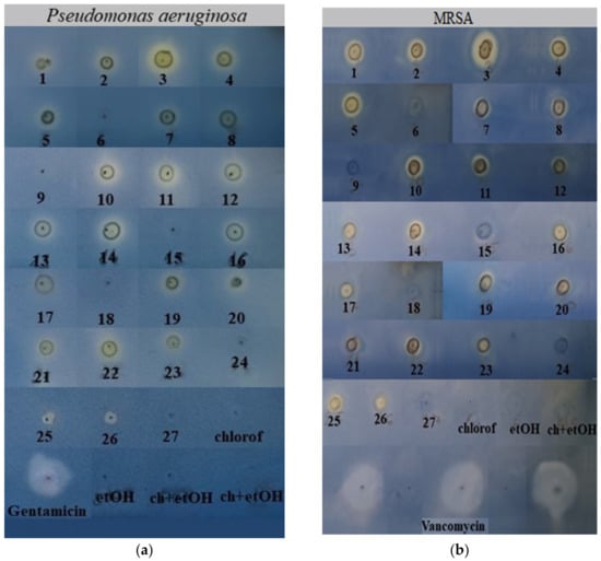 Using the TLC-DB method, the antibacterial activity of the extracts without separation was tested against P. aeruginosa and MRSA (Figure 1a,b). Antibacterial activity was expressed in diameter of the inhibition zone (mm) (Table 1, Figure 2 and Figure 3). Chloroform and absolute ethanol as negative controls did not inhibit the growth of either bacteria. Gentamicin was used as positive control in the case of P. aeruginosa, which was more sensitive to this antibiotic than to any of the plant extracts. In general, the highest inhibition zones were observed for the plant samples extracted at 20 MPa. Lower temperatures also facilitated the extraction of biologically active components. Samples that did not inhibit bacterial growth were prepared at 10 MPa in each case.