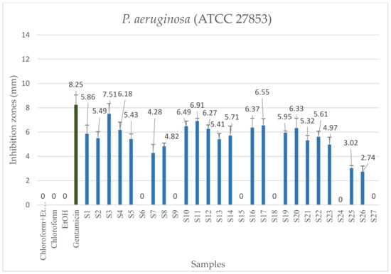 Antibacterial activity of each clary sage extracts and gentamicin as positive control on P. aeruginosa. The numbering of the samples is the same as that shown in Table 1.