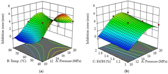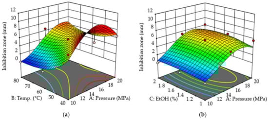 The shape of the response surfaces is very similar in the two cases studied. This is a great advantage in optimization, because the ideal setting parameters for antibacterial activity are very close to each other for the two bacteria. It can be seen from our results that increasing the pressure has a beneficial effect on the antibacterial activity. The threshold where the biologically active components of the clary sage extract become soluble can be found at around 10 MPa. The higher pressure range is also more favorable from the aspect of the extraction yield [29,43], because with the increase in the pressure, the density of the liquid increases as well, which results an increased solubility of the components. Therefore, the higher the extraction pressure, the smaller the volume of fluid necessary for a given extraction [44]. However, it should be kept in mind that higher densities could increase the co-extraction of undesirable substances, which could alter the solubility of biologically active components. In our case, this did not occur at a pressure of 20 MPa yet.