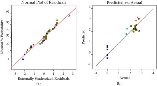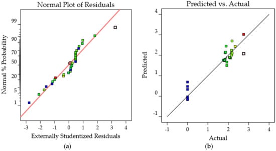 Figure 6a,b demonstrate the strong nearness between the measured values and those forecasted by the statistical calculation, as illustrated by flocking together close to the straight line. Indeed, the coefficients of determination, P. aeruginosa R2 = 0.8703 and MRSA R2 = 0.8799, are suitable values determining the relationship between the predicted and actual values. Figure 7a,b show the actual versus predicted values. The location of the runs near the straight line proves that the difference between the observed and the predicted values was very small [33]. The results show that the predicted and actual values are sufficiently close to each other, which validates that the models are suitable for predicting results and optimizing extraction.