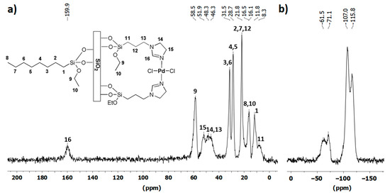 (a) Solid-state 13C and (b) 29Si CP-MAS NMR spectra of catalyst 2.