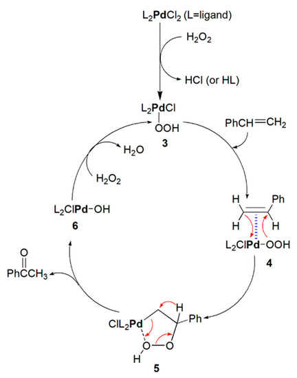 - Walker, K.L.; Dornan, L.M.; Zare, R.N.; Waymouth, R.M.; Muldoon, M.J. Mechanism of Catalytic Oxidation of Styrenes with Hydrogen Peroxide in the Presence of Cationic Palladium(II) Complexes. J. Am. Chem. Soc. 2017, 139, 12495–12503. [Google Scholar] [CrossRef] [Green Version]