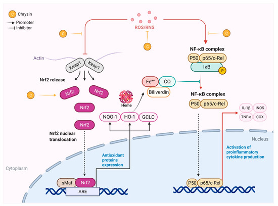 The Nuclear factor erythroid 2-related factor 2 (Nrf2), an important transcription factor for mediating the anti-oxidant effects, is upregulated by chrysin [15]. Upon activation, Nrf2 uncouples from Keap1 and migrates to the nucleus, where it binds to the anti-oxidant response element (ARE) and activates the downstream processing of heme oxygenase-1 (HO-1) and NAD(P)H quinone oxidoreductase 1 (NQO-1) (Figure 3). The downstream signaling of Nrf2 stimulates the production of anti-oxidant factors (SOD, GSH, and GST), and thus prevents oxidative stress-induced cellular damage [15].