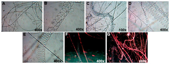 The multiple structures of nanofibers enriched by selenium nanoparticles; (A,B): red selenium nanopowder, (C): grey selenium nanopowder, (D–G): aqueous-ethanol SeNPs. The light microscopy pictures were made with white light and red laser illumination.