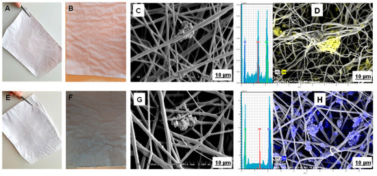 Nanofiber sheets enriched by selenium nanopowder and their SEM images with EDS; (A,C): 1% red selenium, (B,D): 10% red selenium, (E,G): 1% grey selenium, (F,H): 10% grey selenium.