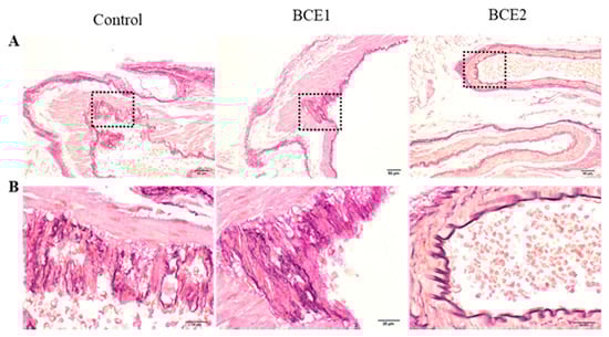 Representative images of foam cell uptake in the tunica intima obtained using Elastica van Gieson staining in the Control (high-fat diet without BCE), BCE1 (high-fat diet supplemented with 1% BCE powder), and BCE2 (high-fat diet supplemented with 3% BCE powder) groups. (A) Lower magnification image (100×, scale bar = 50 µm) and (B) higher magnification image of the boxed areas shown in panel A (magnification 400×, scale bar = 20 µm).