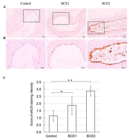 Immunohistochemical staining of eNOS in the Control (high-fat diet without BCE), BCE1 (high-fat diet supplemented with 1% BCE powder), and BCE2 (high-fat diet supplemented with 3% BCE powder) groups. (A) eNOS expression at a lower magnification (200×, scale bar = 20 µm). (B) A higher magnification image of the boxed areas shown in panel A (400×, scale bar = 20 µm). (C) Scoring of staining intensity of eNOS. Data are expressed as the mean score ± standard error. * p < 0.05, ** p < 0.01.