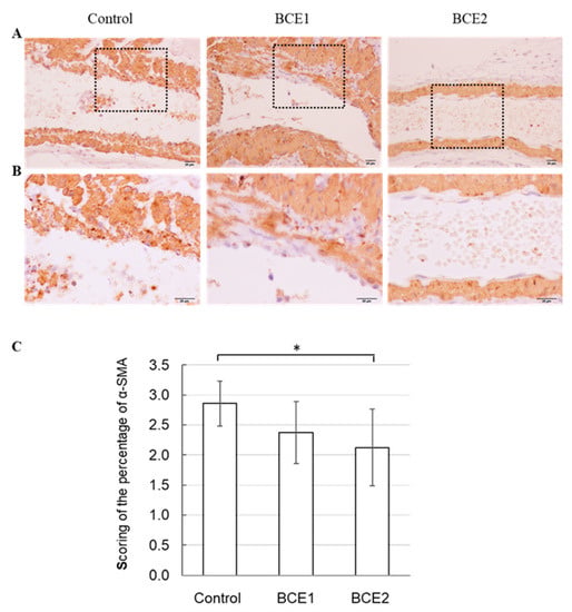 Immunohistochemical staining of α-SMA in the Control (high-fat diet without BCE), BCE1 (high-fat diet supplemented with 1% BCE powder), and BCE2 (high-fat diet supplemented with 3% BCE powder) groups. (A) α-SMA expression at a lower magnification (200×, scale bar = 20 µm). (B) A higher magnification of the boxed areas shown in panel A (400×, scale bar = 20 µm). (C) Scoring of the percentage of α-SMA-positive cells in the tunica intima of the specimens from each group. Data are expressed as the mean score ± standard error. * p < 0.05.