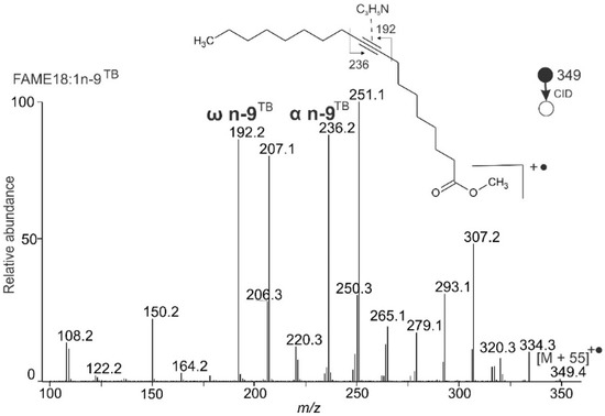 Figure 3 shows the MS/MS spectrum of FAME 18:1n-9TB (stearolic acid methyl ester) [M + 55]+• adduct. The abundant fragments m/z 236.2 (α n-9TB) and m/z 192.2 (ω n-9TB) clearly indicated a triple bond in the n-9 position. Unlike FAMEs with double bonds, the satellite fragments differed by +15 Da from αTB and ωTB (m/z 207.1 and m/z 251.1, respectively). The intensities of the diagnostic fragments and their +15 Da satellites were similar, allowing us to recognize these peaks in the spectrum easily. Such a pattern distinctly indicated a triple bond. Satellite fragments differing by +14 Da, typical for double bonds, were present at significantly lower intensities.