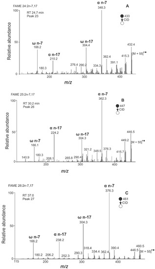 APCI MS/MS spectra of the [M + 55]+• adducts of FAME from B. pratorum interpreted as FAME 24:2n-7,17 (A), 25:2 n-7,17 (B), and 26:2n-7,17 (C).