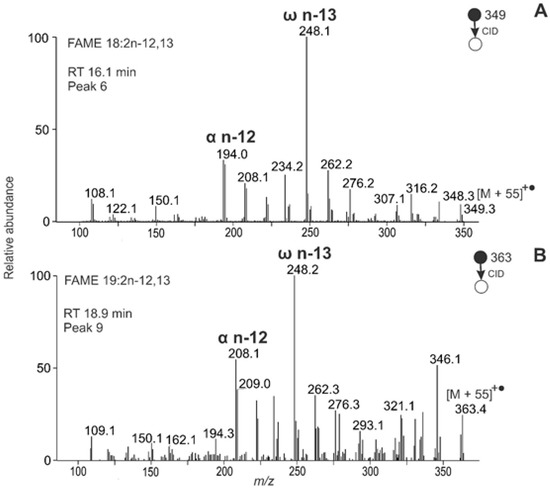 The most abundant peak tR 16.1 min corresponded to FAME 18:2 with the main fragments m/z 194.0 (α n-12) and m/z 248.1 (ω n-13), Figure 10A. The MBR value of 93 indicated two cumulated double bonds. It was interpreted as FAME 18:2n-12,13, most probably laballenic acid, highly abundant in M. vulgare seeds [61]. The fragmentation spectrum of FAME 18:2n-12,13 with the allenic system differed conspicuously from other arrangements of double bonds. The α fragment was accompanied by an α + 1 fragment with almost the same intensity, providing a double peak m/z 194/195 (Figure 10A). Analogous fragmentation behavior was also observed for other FAMEs with cumulated double bonds and helped us interpret allenic motifs in FAMEs. For instance, the compound eluting in 18.9 min was interpreted as FAME 19:2n-12,13. Its MS/MS spectrum provided m/z 208.1 (α n-12), m/z 209.0 (α n-12 + 1), and m/z 248.2 (ω n-13), corresponding to an MBR of 93 (Figure 10B). Analogously, peak tR 22.6 min showing m/z 222.1 (α n-12), m/z 223.1 (α n-12 + 1), and m/z 248.2 (ω n-13) was consistent with 20:2n-12,13 (spectrum not shown).
