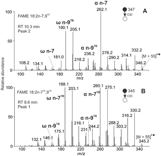 APCI MS/MS spectra of the [M + 55]+• adducts of acetylenic FAME from Santalum album seeds interpreted as FAME 18:2n-7,9TB (A) and 18:2n-7 TB,9TB (B).
