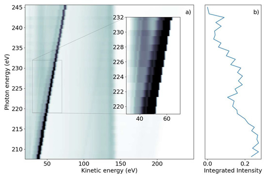 In the lower kinetic energy range, we observed a non-dispersing broad line centered around Ekin = 42.5 eV. At higher kinetic energies, we observed a non-dispersing band around Ekin = 140 eV with a tail towards lower energies. Analogous to the L2,3-edge, we generated a NEXAFS spectrum from the integrated electron yield, shown in Figure 2b. In addition to the decrease in intensity from lower to higher photon energies, an absorption increase starting at hυ = 222 eV with a maximum at hυ = 227 eV was observed.