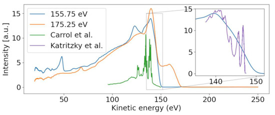 Photoelectron spectra for photon energies above (175.25 eV) and below (157.25 eV) the sulfur 2p binding energy. A dispersive behavior of the valence band is visible, moving from ~140 to ~160 eV with increasing photon energy. Our valence spectrum at hυ = 155.75 eV is compared with a He-lamp-induced valence photoelectron spectrum (purple) from Ref. [24] in the inset, which is scaled in kinetic energy according to the difference of photon energies used in the experiments. Conversely, the Auger–Meitner feature is only present for the higher photon energy. The Auger–Meitner data are compared with the sulfur Auger–Meitner spectrum of OCS (green) from Ref. [26].
