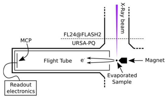 Figure 5 presents a sketch of the URSA-PQ apparatus. The use of an MBES allows for high collection efficiency. A permanent magnet with a soft iron pole produces a high magnetic field in the interaction region, which adiabatically changes into a homogeneous solenoid field that guides the confined electrons through an almost 2 m long flight tube [41]. The emitted electrons are detected by a multi-channel plate (MCP) assembly at the end of the flight tube. Their kinetic energy can then be obtained from the time-of-flight measurements. A time-of-flight spectrum was recorded for each pulse of the FEL, and the results were subsequently averaged. An electrostatic lens was used to apply a retardation potential to the electrons as they enter the flight tube, slowing them down and thus increasing the time-of-flight resolution. Calibration of the spectrometer was carried out using Kr-MNN Auger–Meitner electrons [25]. Using the calibration data together with a geometric model of the flight tube, a time-of-flight to kinetic energy conversion function was developed. This function was then adapted to enable the conversion of data acquired under different retardation settings. Specifically, we used recorded krypton spectra to construct a model of the spectrometer and extrapolated it to other retardation settings/energy ranges. The resolution (E/ΔE) was found to be around 40 under the chosen settings [25]. For each X-ray pulse, FLASH provides a shot-to-shot measurement of the pulse energy (photon number) through the use of gas-monitor detectors (GMD). We used these data to normalize our electron spectra.